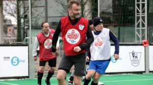 The teams were captained by footballing legends Alan Shearer and Robbie Savage, with guest player appearances from Hugh Dennis (shown right, with my button in the background), John Bishop, Rachel Riley and Fatman Scoop amongst many, many more.